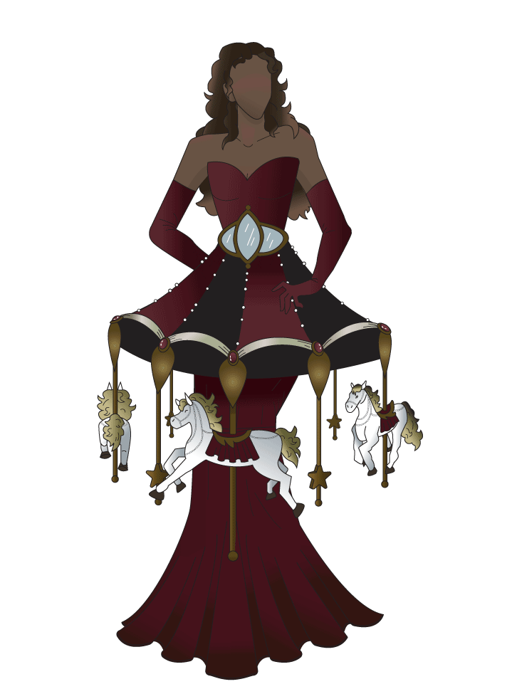 The velvet gown itself is a mermaid-tail style with princess seams shaping it to the body. The seams extend down to the paneled skirt, allowing for a voluptuous drape. The mirror belt and carousel hide the corset back closure. There are three total layers to the gown. The fashion front matches that of the carousel to create a sense of unity. A soft silk lining protects the body from the pile fabric, and in between them exists a stiff interfacing made from canvas and boning that gives the gown its structure.